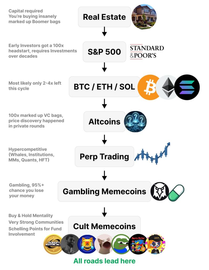 Comme l’indique son image, la transition doit désormais se faire des memecoins à “gambling” vers les memecoins de “cultes”, où la philosophie du holding y est le plus fort.