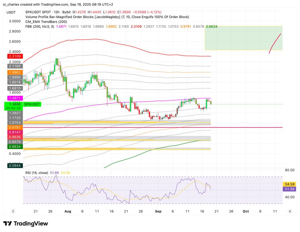 Le graphique en 12H de SPX montre que le prix doit absolument franchir cette résistance médiane de Fibonacci (en rose) à 1,48 dollar pour enfin retrouver un élan haussier durable. Pour l’instant, le prix est constamment rejeté. Mais un franchissement des 118 000 dollars du Bitcoin devrait insuffler cette poussée haussière nécessaire pour ensuite viser les 2,3 dollars, selon le FBB. Soit une hausse potentielle de 65%.
