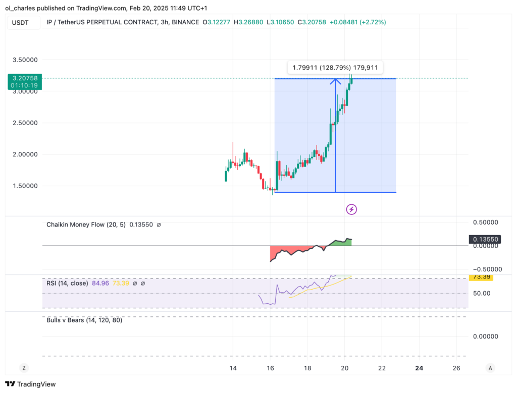 Après son listing sur de nombreux exchanges, dont Binance en perpétuel, le jeton IP a explosé de 128% depuis le 16 février, soit en 4 jours seulement. Actuellement à un prix de 3,2 dollars, le jeton se situe entre FOMO et prises de profits de la part des investisseurs.