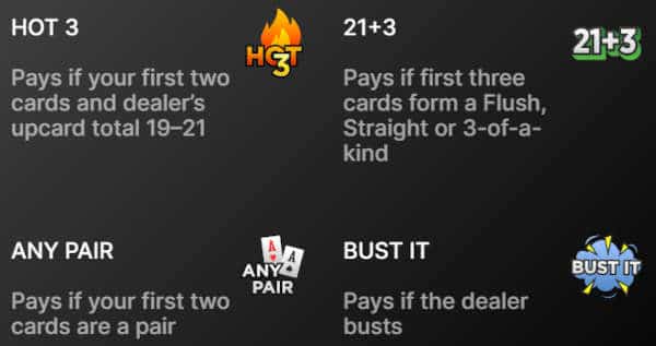 Le jeu propose plusieurs mises secondaires : Any Pair, 21+3, Hot 3 et Bust It, offrant des gains pouvant aller jusqu’à 250:1.