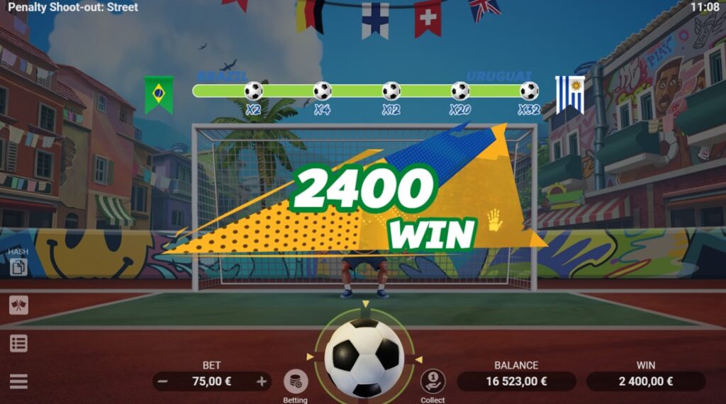 Une fois votre mise placée, l’action commence véritablement. Dans Penalty Shoot Out Street, vous devez réaliser une série de tirs au but consécutifs pour augmenter votre multiplicateur et, par conséquent, vos gains potentiels. Chaque penalty réussi fait grimper le multiplicateur, tandis qu’un tir manqué ou arrêté par le gardien de but met fin à votre série.