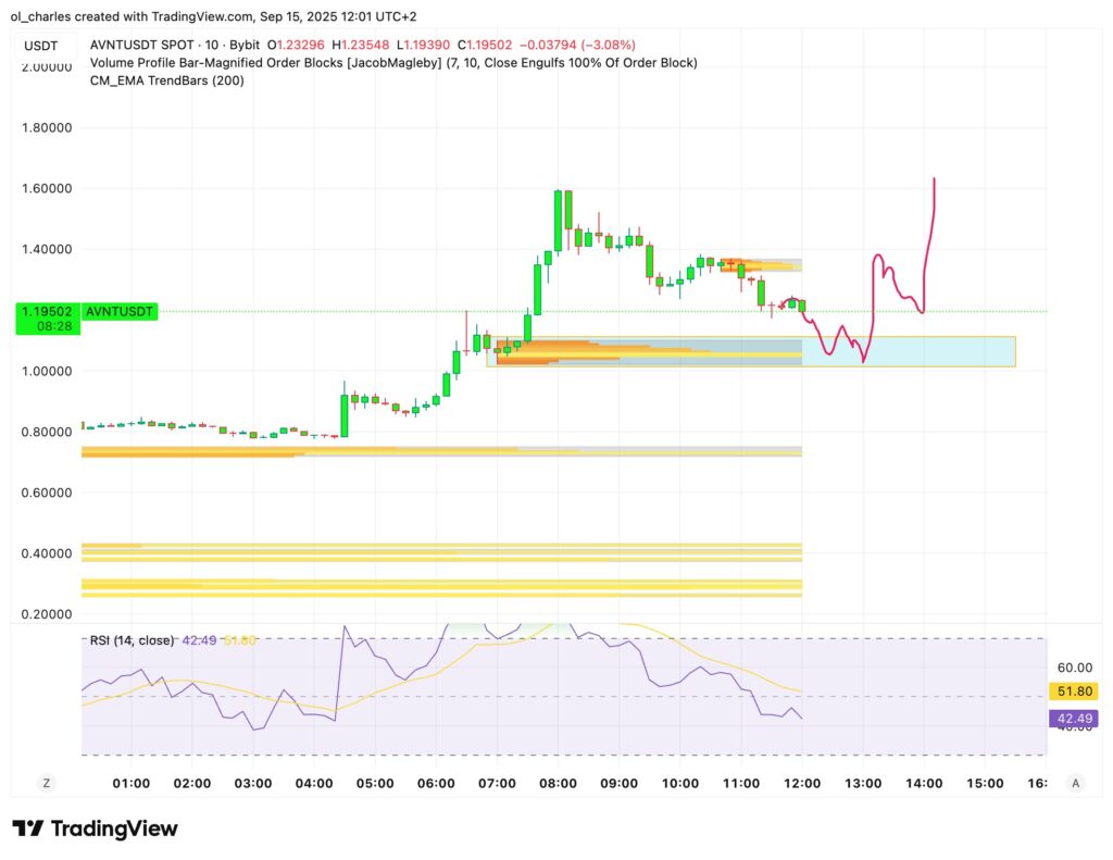 Actualmente a 1,2 dólares, AVNT ha caído un 26% desde su máximo de 1,6 dólares. Una zona de demanda en 1,02-1,1 dólares podría servir como nuevo trampolín para un nuevo ATH. Sin embargo, la pérdida de este nivel podría llevarlo de vuelta a su último soporte crítico en 0,87 dólares.